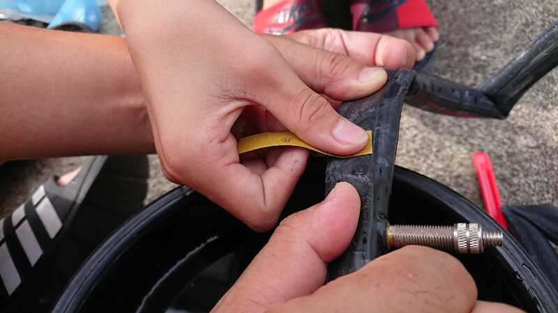 チューブを取り出し水の張ったバケツに浸しながら空気の漏れている箇所を探します!
