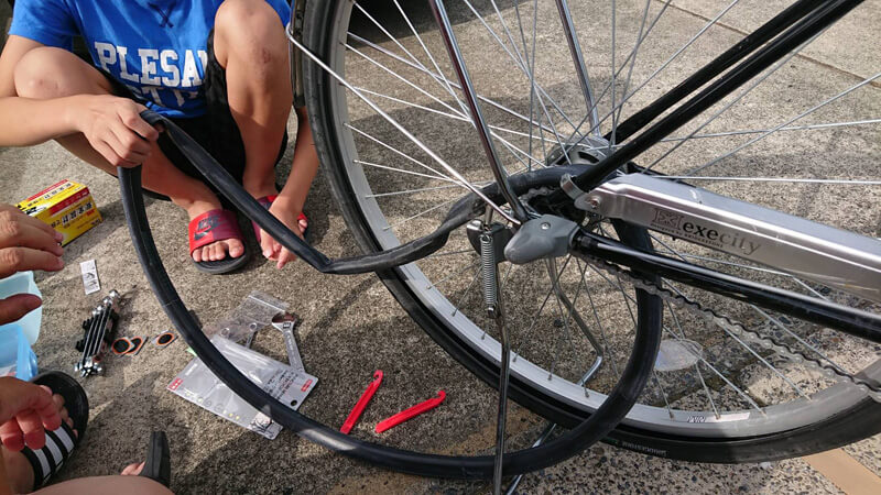 家は学校が始まるのに自由研究が未だでした・・・ ので、パンクしたままの自転車の修理を息子としてみました!
