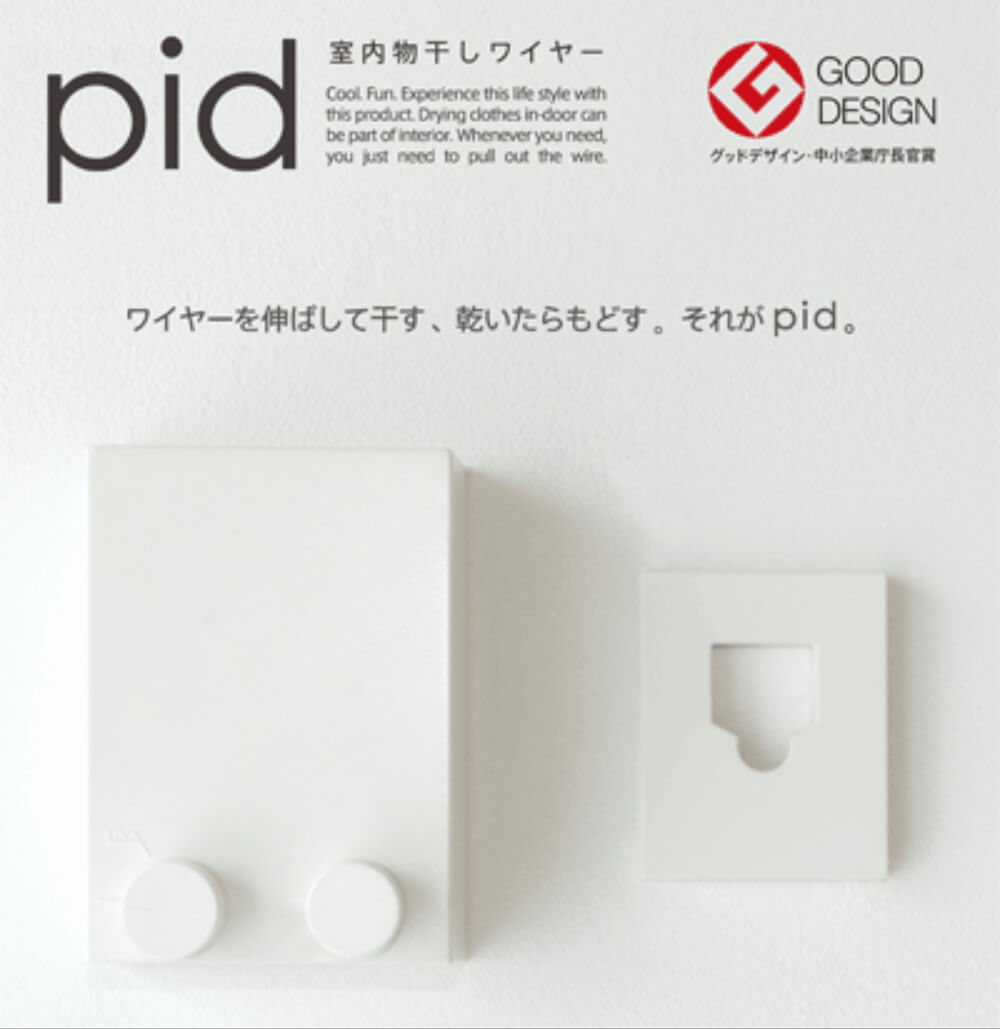 物干金物とはちょっと違いますが、森田アルミ工業㈱さんでだしている「pid 4M」という商品です。(壁付けワイヤー商品)こちらもグッドデザイン賞に受賞しているもので、色は白一色のみです。私が最初いだいた率直な感想、「これどう使うの?」。見た目では物干しには見えません。必要な時だけワイヤーを伸ばして、手軽に洗濯物を干せるみたいです。「生活感の象徴である洗濯物がpidと共にインテリアの一部になるような暮らしをイメージ」しているみたいです。こんなのもあるんだなぁ~と思った一品でした。