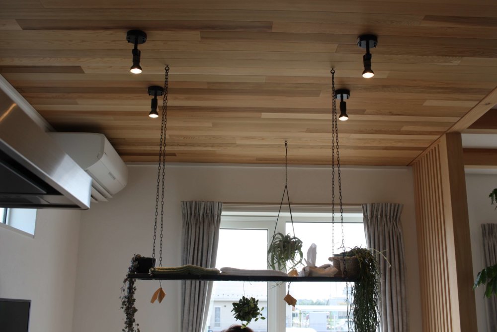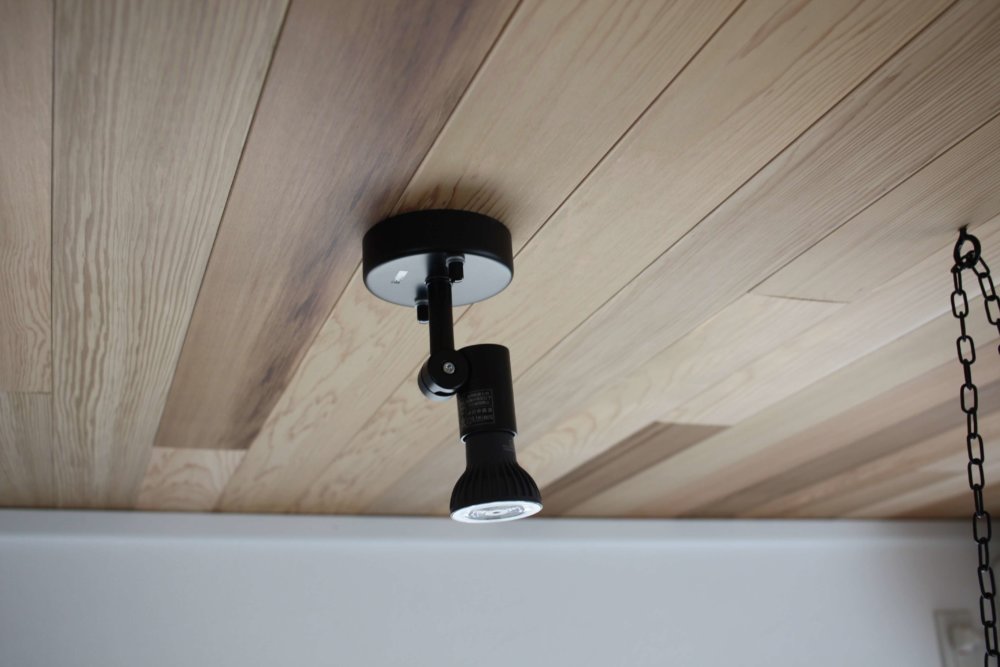 天井からつるさないスポットライトは、スタイリッシュかつダイニング周りがスッキリ広く見えます。