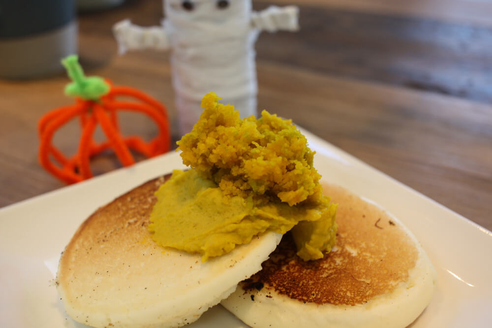 卵・牛乳・小麦粉を使わない米粉のパンケーキ&素朴なかぼちゃソース添えです!