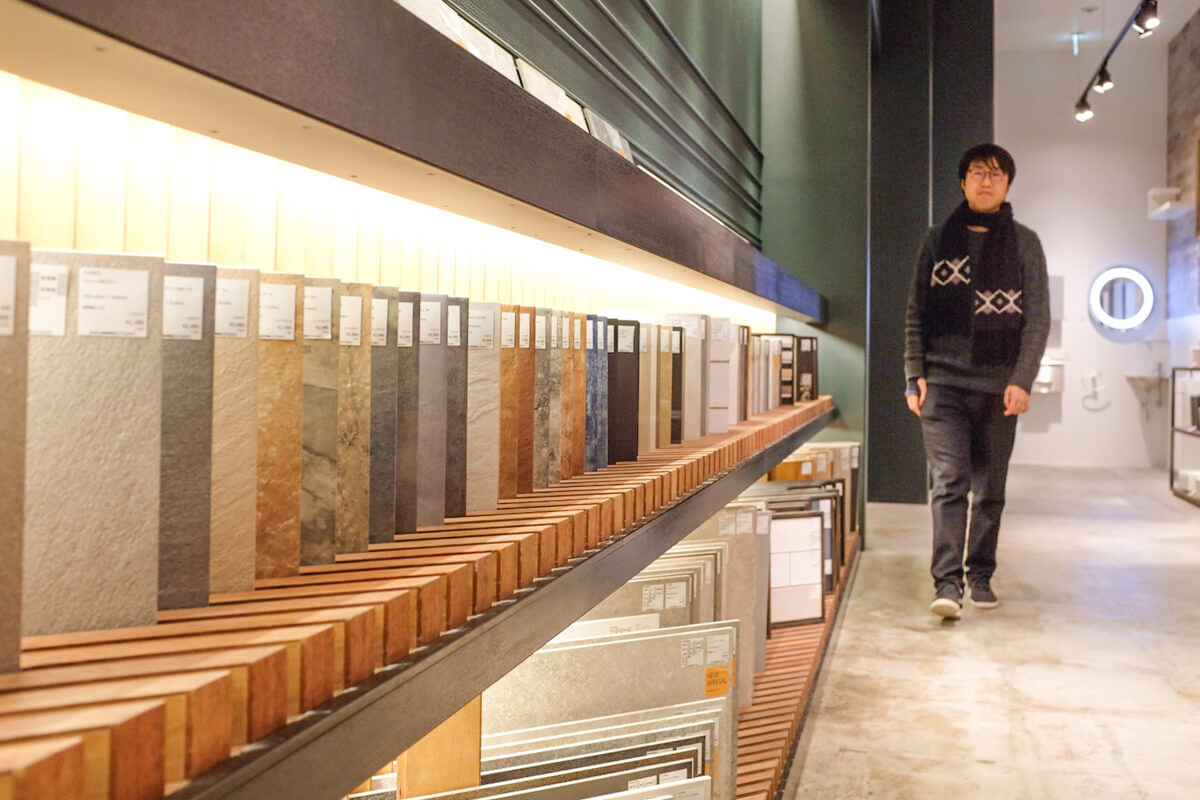 あと、仙台ショールームでは、玄関の床などに貼るタイルもズラ〜っと展示されています。