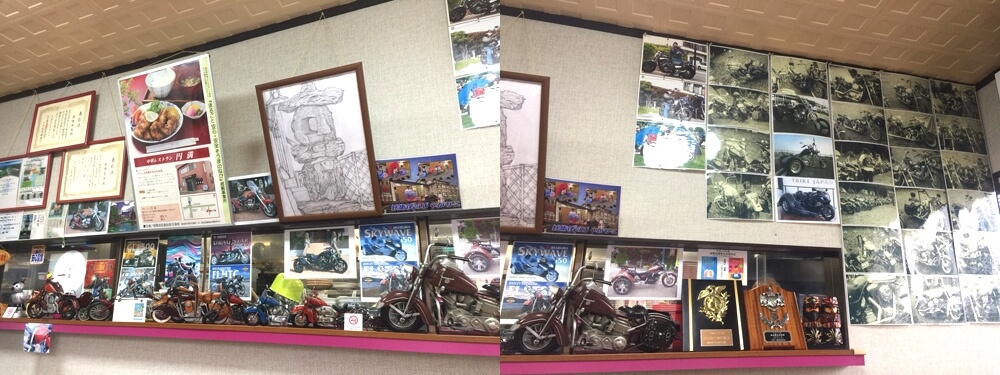今回は「円満」というお店に御邪魔させていただきました。始めてはいるお店です。店一面にバイクの写真がいっぱい飾ってあります。店主の方がバイク好きみたいですね!バイク木製玩具も飾ってあります。心なしかバイク好きの方が多く訪れているように見受けられます。弊社の青田もバイク好きなので、写真を見ながら店主と話がはずんでいました。こういった個性的なお店は久しぶりです。