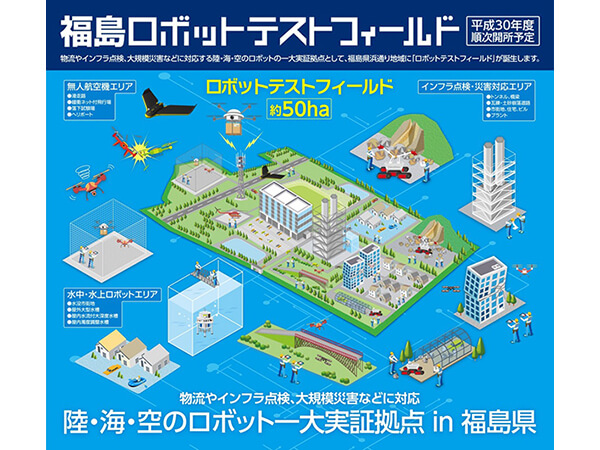 2020年にロボット産業の集積地を目指す福島県。この「イノベーション・コースト構想」の核となる「ロボットテストフィールド」が整備される南相馬市は、今後「ロボットのまち福島県、南相馬」を目指すということで、南相馬市では2016年6月12日に福島県浪江町と共催で「ロボットテストフィールドシンポジウム」を開催、また同年10月12日には東京都において「ロボット産業セミナー」を開催するなど、PRも積極的に行っています。