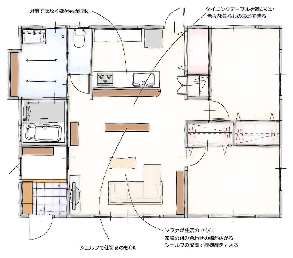 こうすればスペースが生まれただけでなく、LDKの延長線上で色んな使い方が出来るようになるので、暮らしに幅が生まれますし、家具を選ぶ範囲もぐっと広くなります。